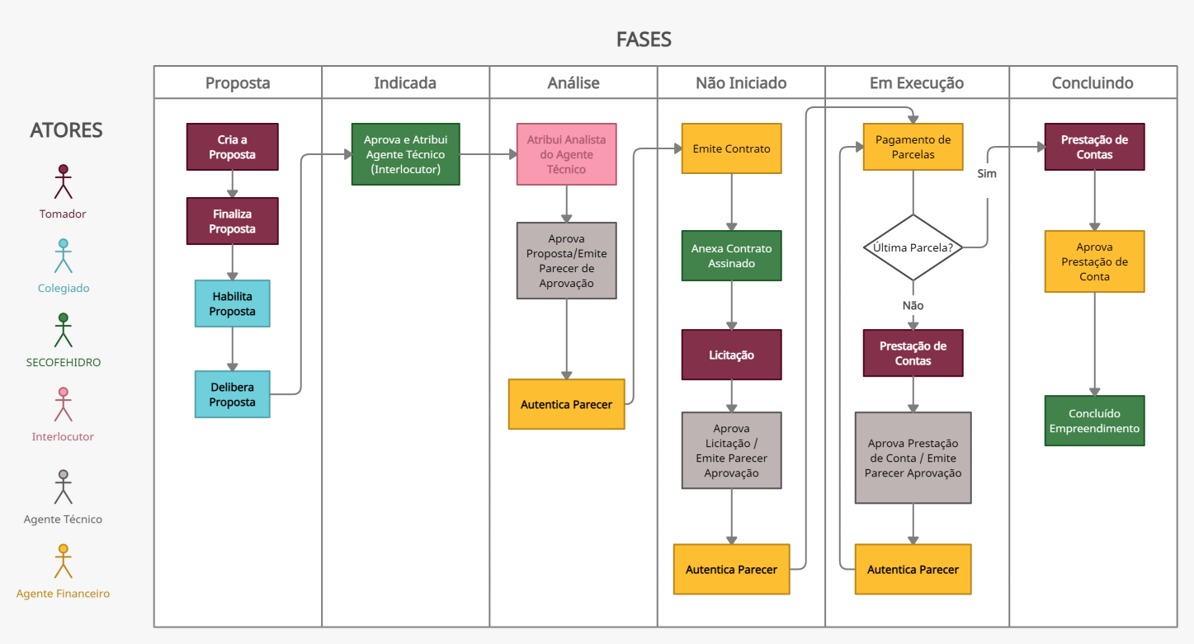 Após a indicação, os empreendimentos são encaminhados à SECOFEHIDRO e, posteriormente, ao Agente Técnico para análise. Com a aprovação técnica, o Agente Financeiro realiza as análises jurídicas e econômico-financeiras e emite o contrato de financiamento, que deve ser assinado pelo tomador e pelo COFEHIDRO.